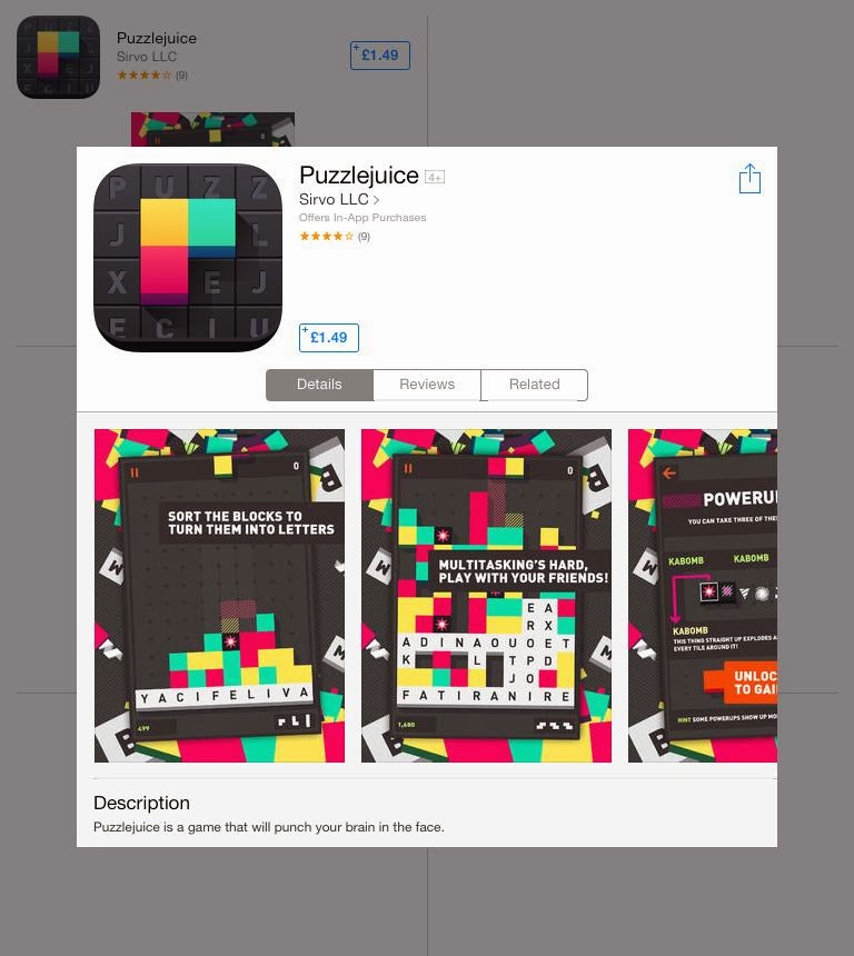 PuzzleJuice is an educational gaming app, combining colour-matching, block tessellating and word-combining.