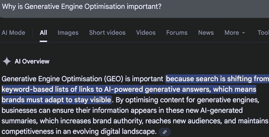 GEO is important because the adoption of AI search shows no signs of slowing down, which means in practice that business owners need to either optimise their websites for AI search or risk losing visibility, and losing out to the competition.